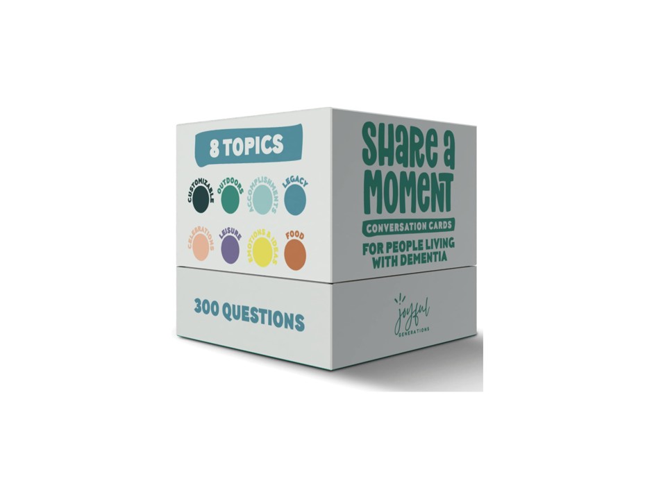 A deck of 150 laminated, water‑resistant cards filled with dementia‑friendly prompts, thoughtfully created to spark real connection and gentle smiles